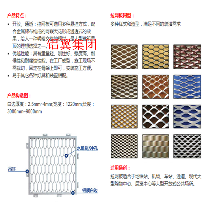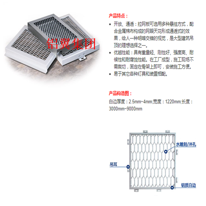 專業(yè)生產(chǎn)鋁拉網(wǎng)板、鋁板網(wǎng)、玻璃棉氈鋁板網(wǎng)吸聲墻面、鋁板沖孔網(wǎng)廠家,經(jīng)驗(yàn)豐富,按圖均可定制。 鋁網(wǎng)板、沖孔鋁板、拉網(wǎng)天花、鋁拉網(wǎng)幕墻、拉伸鋁網(wǎng)、鋁拉網(wǎng)吊頂、幕墻鋁板網(wǎng)等,款式齊全,按圖定制生產(chǎn)。沖孔網(wǎng)鋁板定制孔型:長孔、圓孔、方孔、三角孔、魚鱗孔、橋式孔、菱形孔、五角孔、六角孔、八孔、十字孔、指甲孔、梅花孔、人字孔、及其它異形孔。鋁翼集團(tuán)集研發(fā)、設(shè)計(jì)、生產(chǎn)、定制及銷售服務(wù)為一體的大型拉網(wǎng)鋁單板生產(chǎn)廠家,注冊(cè)資金3180萬元,工廠總占地面積約30萬平方,真正的實(shí)力廠家,接大單急單有優(yōu)勢(shì)。 實(shí)力廠家更值得信賴,源頭工廠直銷價(jià)格更優(yōu)惠,歡迎詢價(jià),歡迎蒞臨公司注冊(cè)地實(shí)地考察!